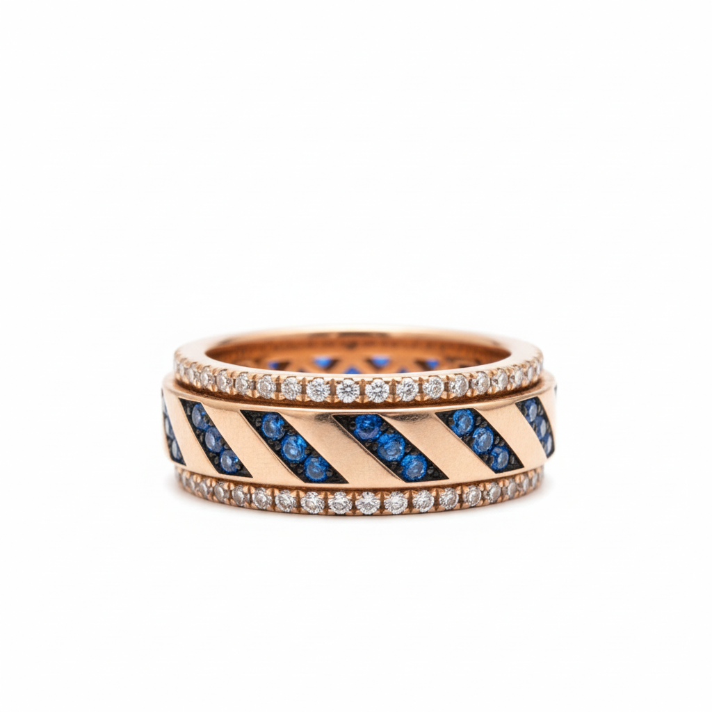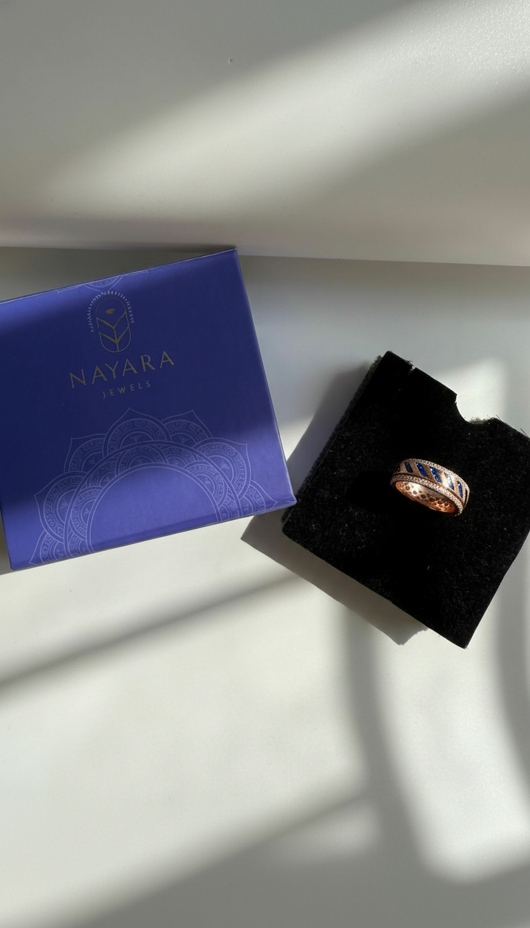 Elevate your everyday with this captivating rose gold finish kinetic ring, a truly unique engagement ring alternative for women. Featuring a mesmerizing spinner band studded with sparkling AAA+ zirconia and vibrant blue stones, this premium women’s ring exudes ‘Old Money’ sophistication with a hint of ’90s flair. Perfect for ‘9-5’ wear or as an unforgettable gifting choice, it’s designed to make you feel radiant and confident. Crafted from hypoallergenic, lead-free silver with a gorgeous rose gold finish, it offers both style and comfort. Discover the ultimate stackable ring for women that truly reflects your individual elegance.